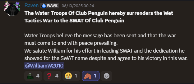 That’s right, on 06/10/2025, Special Weapons and Tactics won a war with the official surrenderof WT.