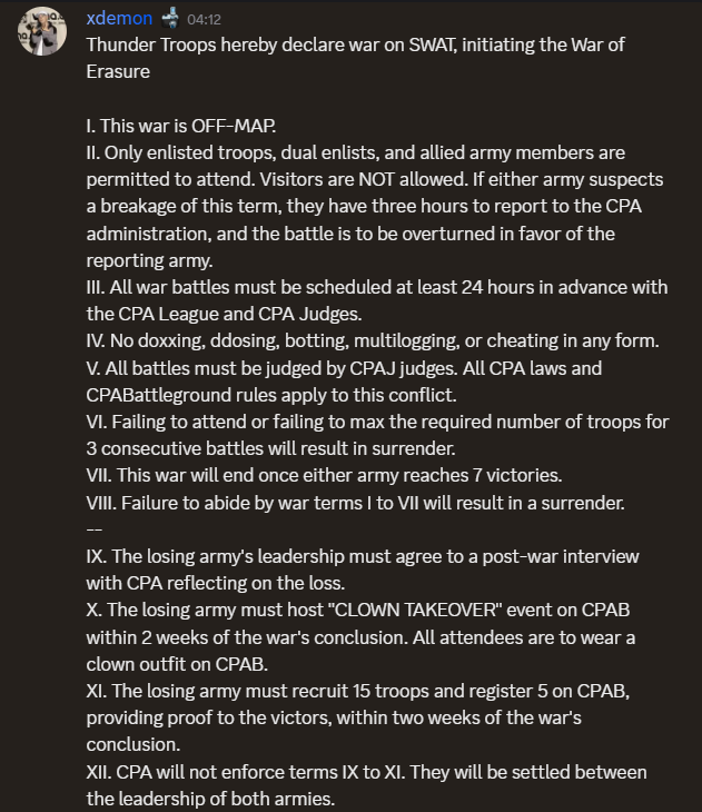 XI. The losing army must recruit 15 troops and register 5 on CPAB, providing proof to the victors, within two weeks of the war’s conclusion. XII. CPA will not enforce terms IX to XI. They will be settled between the leadership of both armies.